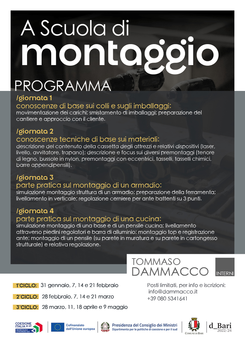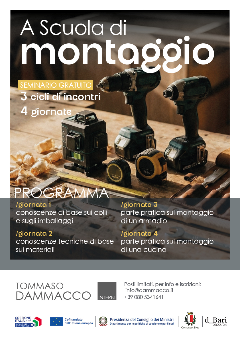 Nei prossimi giorni prenderà il via il corso formativo gratuito “A scuola di montaggio”, offerto dalla Tommaso Dammacco Interni. Il 31 gennaio avrà inizio il 1° ciclo d’incontri ad inaugurare questa nuova esperienza.