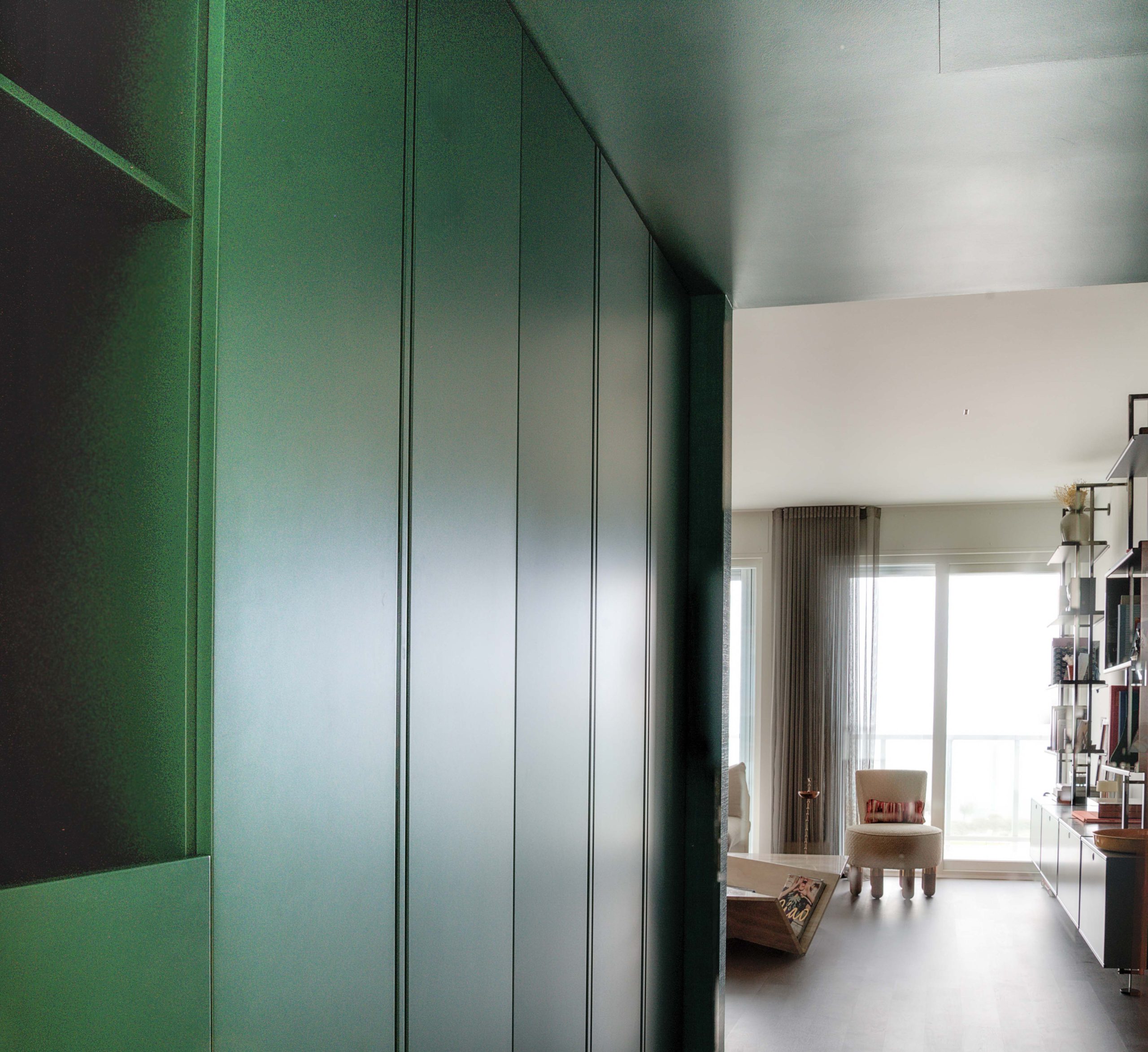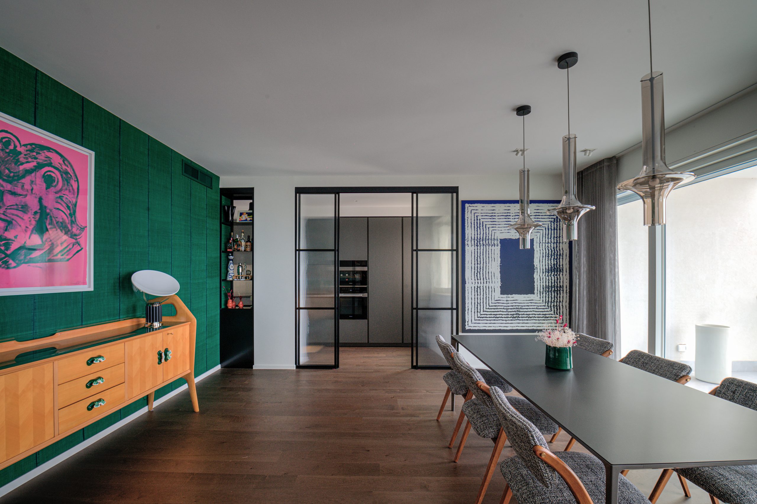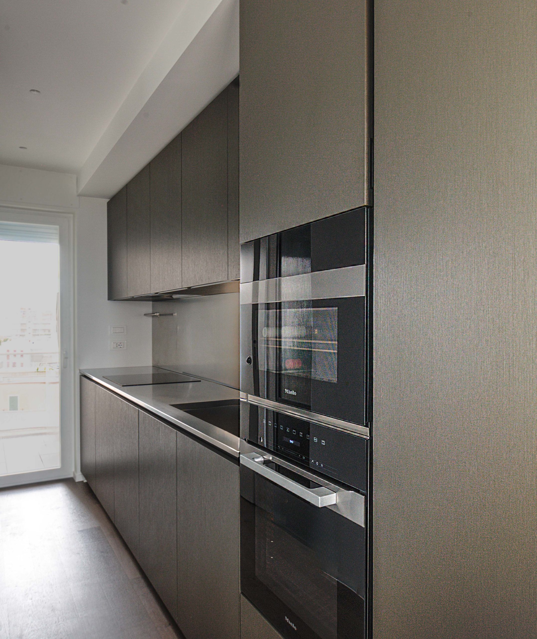Tommaso Dammacco Interni, in collaborazione con Alice Bandiera Interiors, ha arredato un sofisticato appartamento che trova il suo equilibrio nel dialogo costante con il mare. Un ambiente dalla grande personalità, che fin dall’ingresso, concepito come una vera e propria camera di decompressione in cui le pareti, gli arredi e il soffitto si fondono in un verde profondo, prepara lo sguardo all’apertura sul living. Qui due grandi finestre connettono l’interno con il mare e le carte da parati diventano elementi narrativi, fondali materici in cui gli arredi selezionati valorizzano l’incessante ricerca della designer nel bilanciamento tra funzionalità e scelte estetiche. La cucina, massima espressione di questa ricerca, è stata progettata con il modello Alea di Poliform in Silk Grey e top acciaio, materiali affini per vibrazioni cromatiche a quelli selezionati in ogni ambiente domestico.