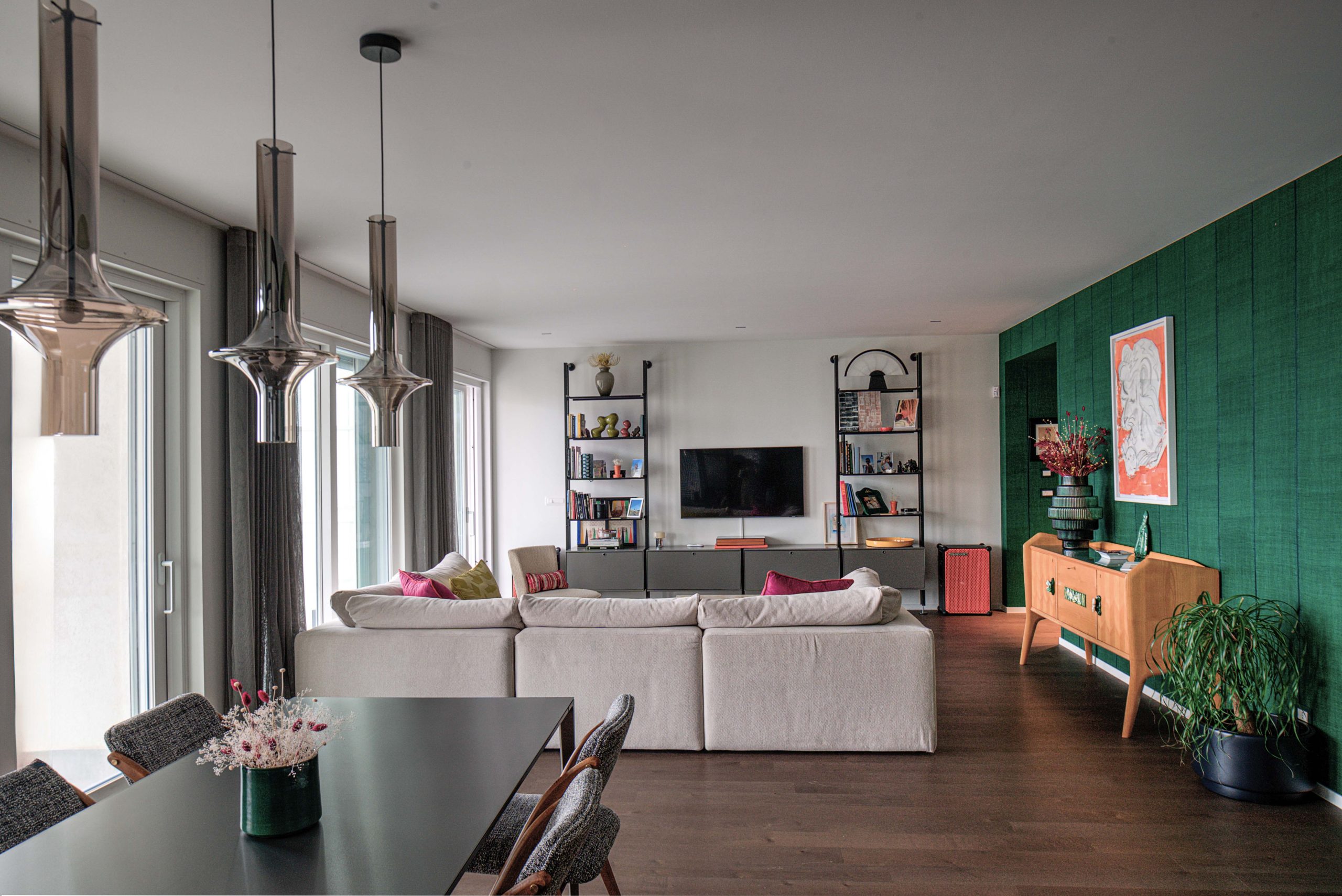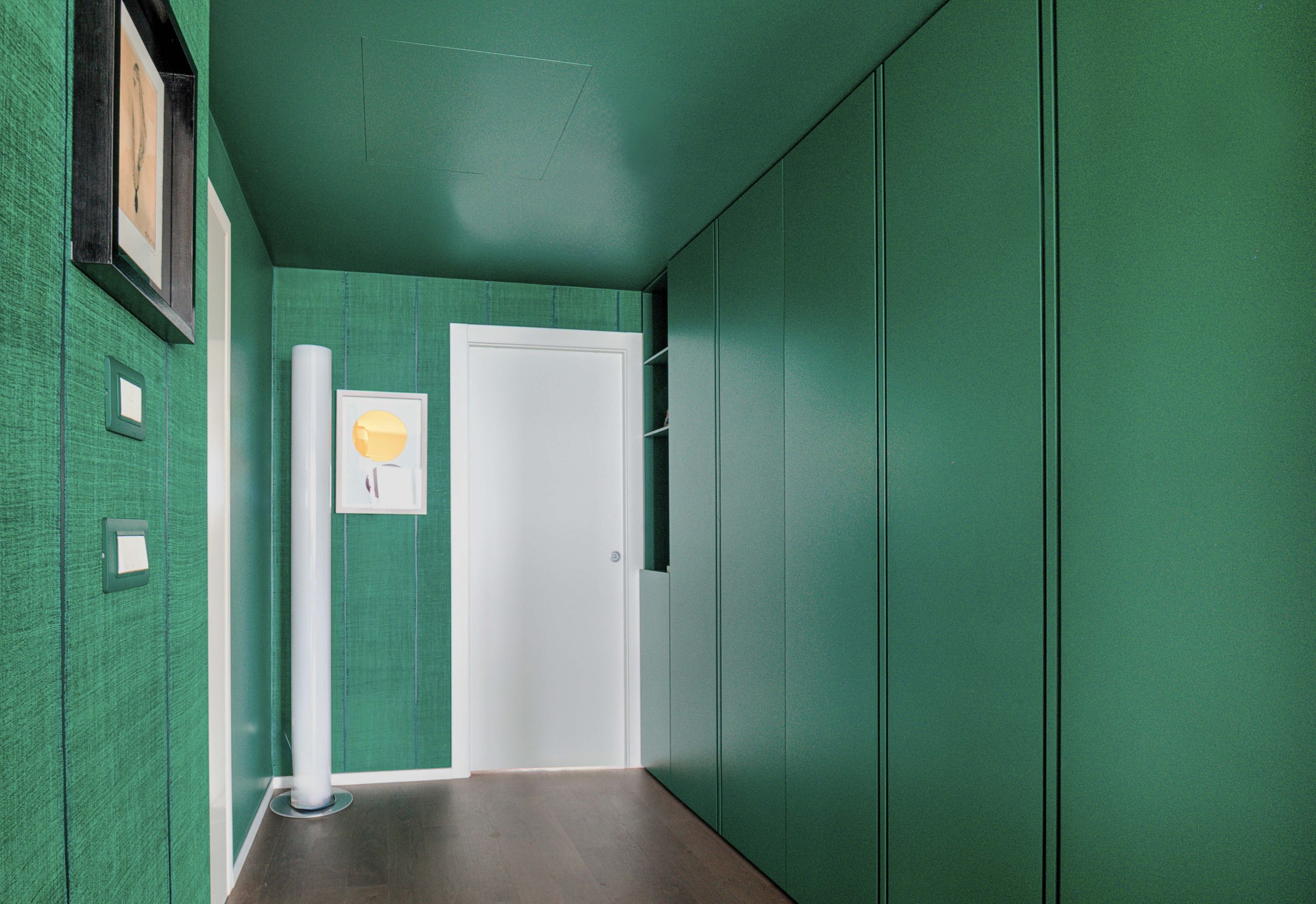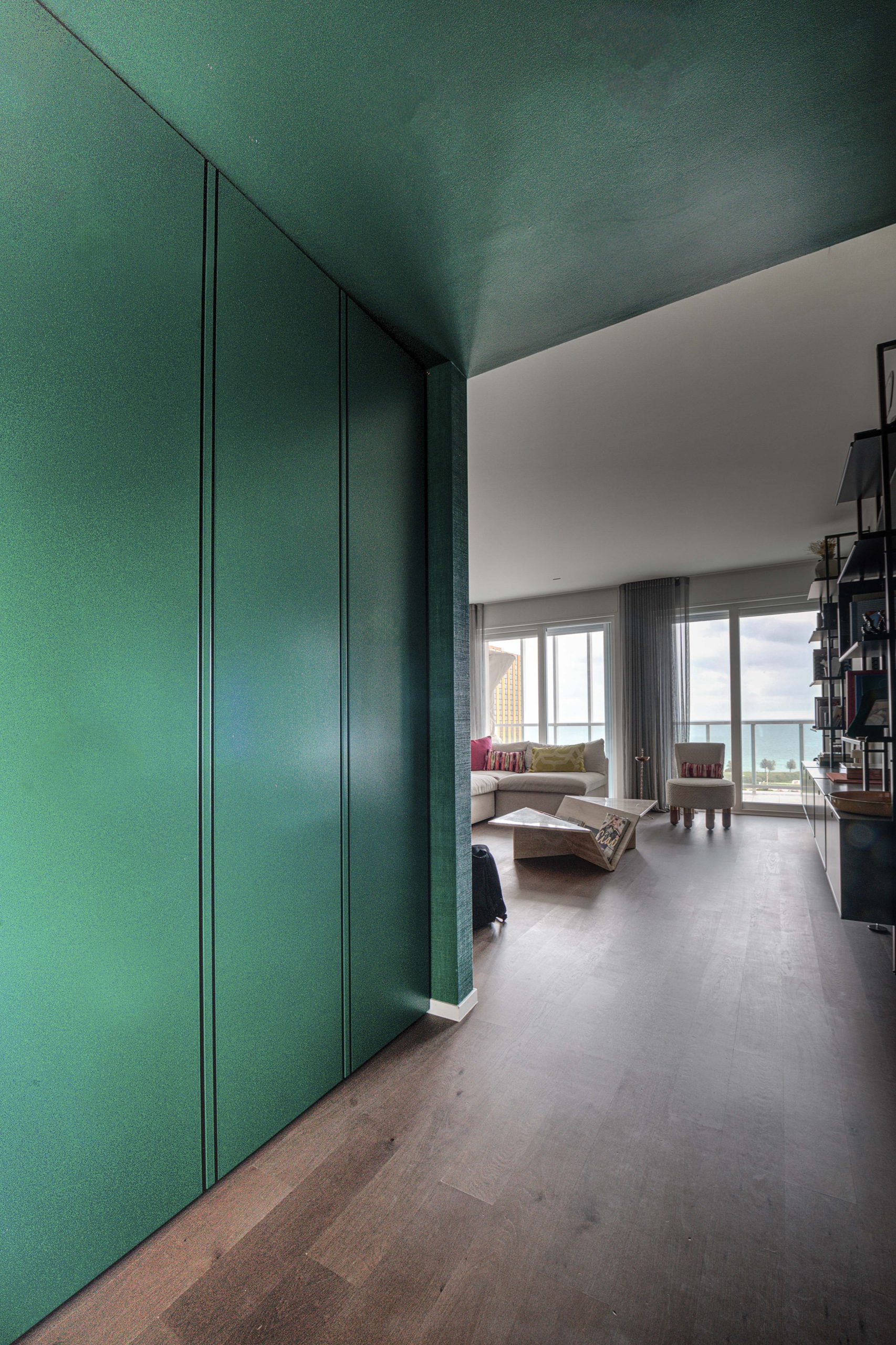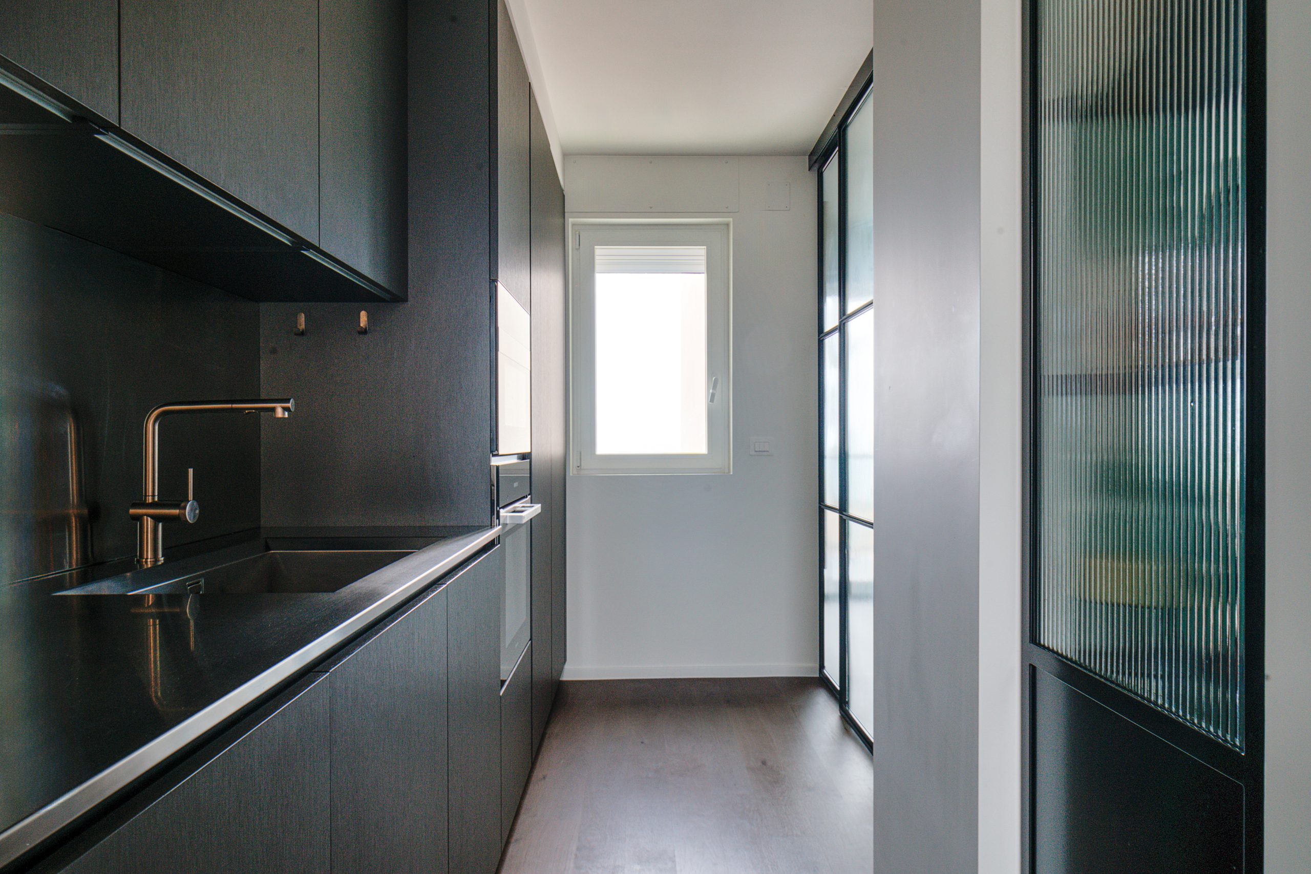 Tommaso Dammacco Interni, in collaborazione con Alice Bandiera Interiors, ha arredato un sofisticato appartamento che trova il suo equilibrio nel dialogo costante con il mare. Un ambiente dalla grande personalità, che fin dall’ingresso, concepito come una vera e propria camera di decompressione in cui le pareti, gli arredi e il soffitto si fondono in un verde profondo, prepara lo sguardo all’apertura sul living. Qui due grandi finestre connettono l’interno con il mare e le carte da parati diventano elementi narrativi, fondali materici in cui gli arredi selezionati valorizzano l’incessante ricerca della designer nel bilanciamento tra funzionalità e scelte estetiche. La cucina, massima espressione di questa ricerca, è stata progettata con il modello Alea di Poliform in Silk Grey e top acciaio, materiali affini per vibrazioni cromatiche a quelli selezionati in ogni ambiente domestico.